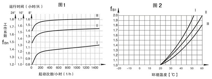 S系列選型:總工作系數f∑取決于每天工作時間,每小時起動次數的工作系數fBn(圖1)和環(huán)境溫度變化的工作系數fB1(圖2),其關系為f∑ =fBn × fB1使選型表中的使用系數fB>f∑。