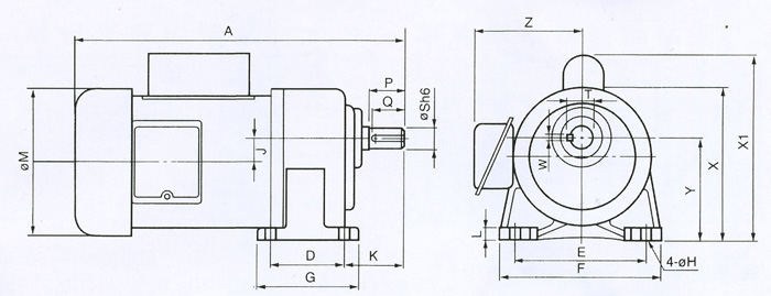 GH單相臥式齒輪減速電機(jī)外型尺寸圖